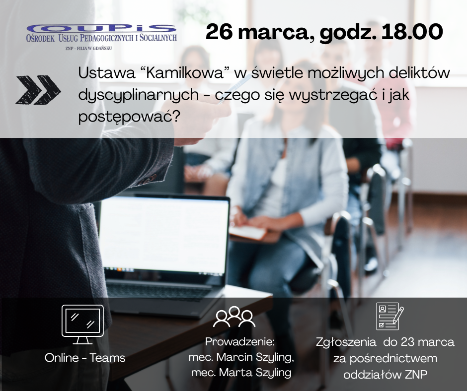 26 marca 2026 r. Szkolenie on-line „Ustawa „Kamilokowa” w świetle możliwych deliktów dyscyplinarnych – czego się wystrzegać i jak postępować?”.